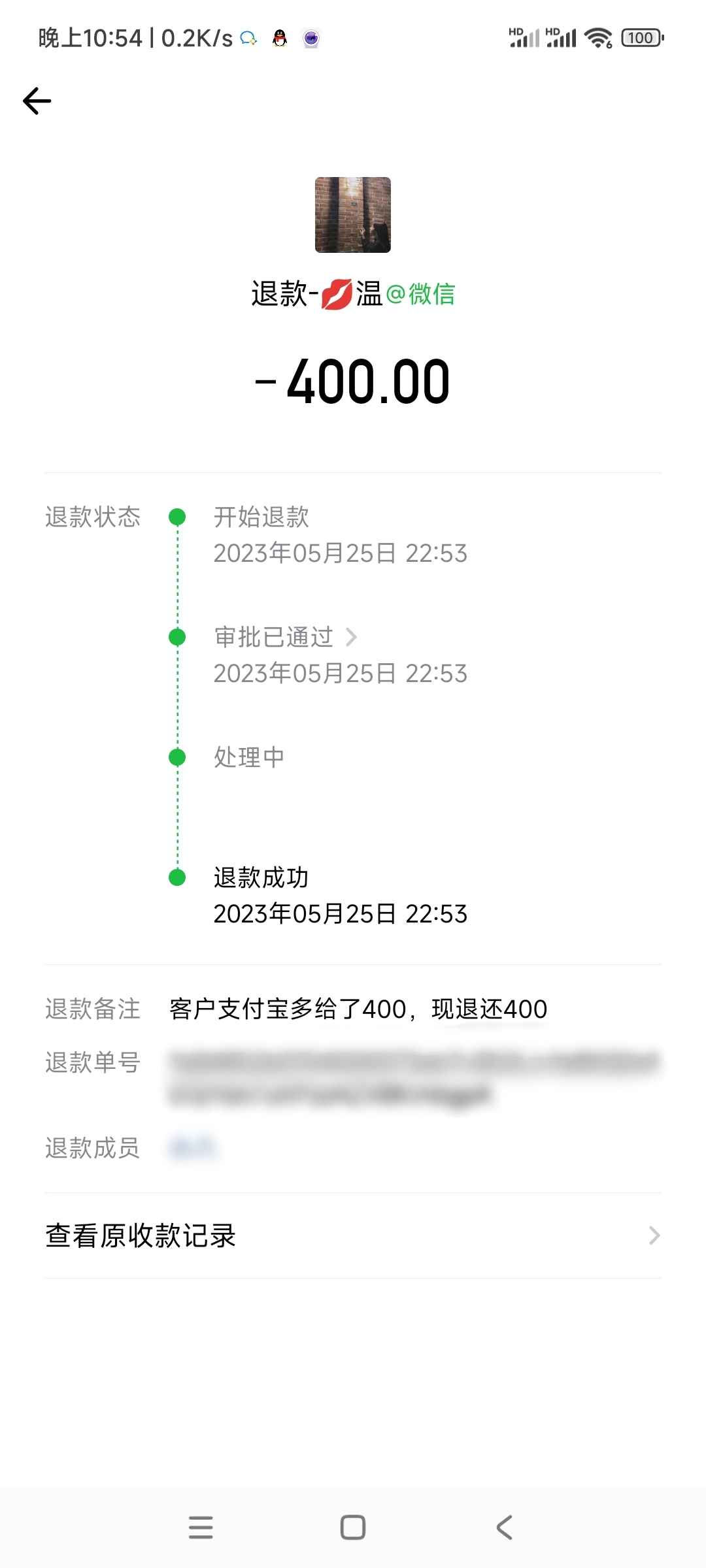 客户不小心支付宝多转了400,我们通过微信帮其原路退回